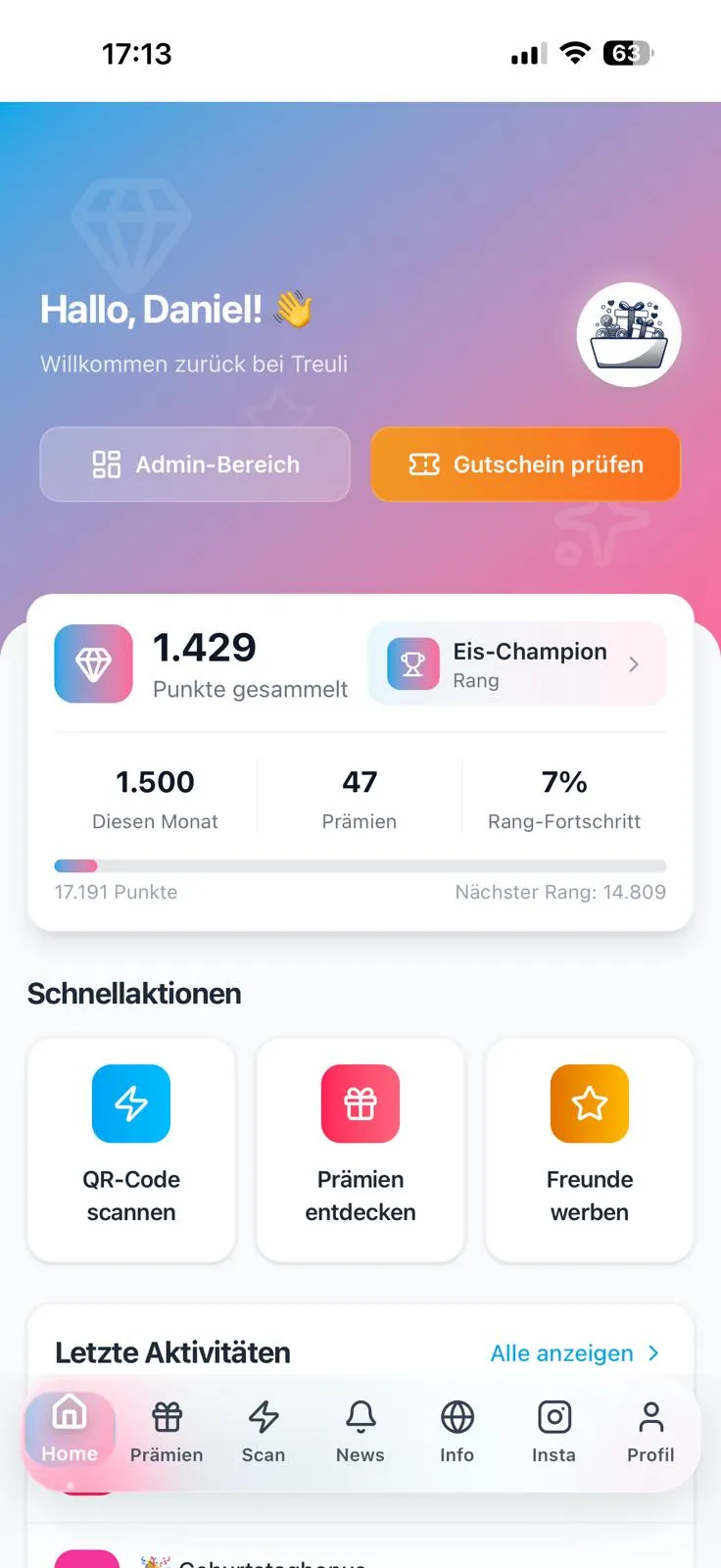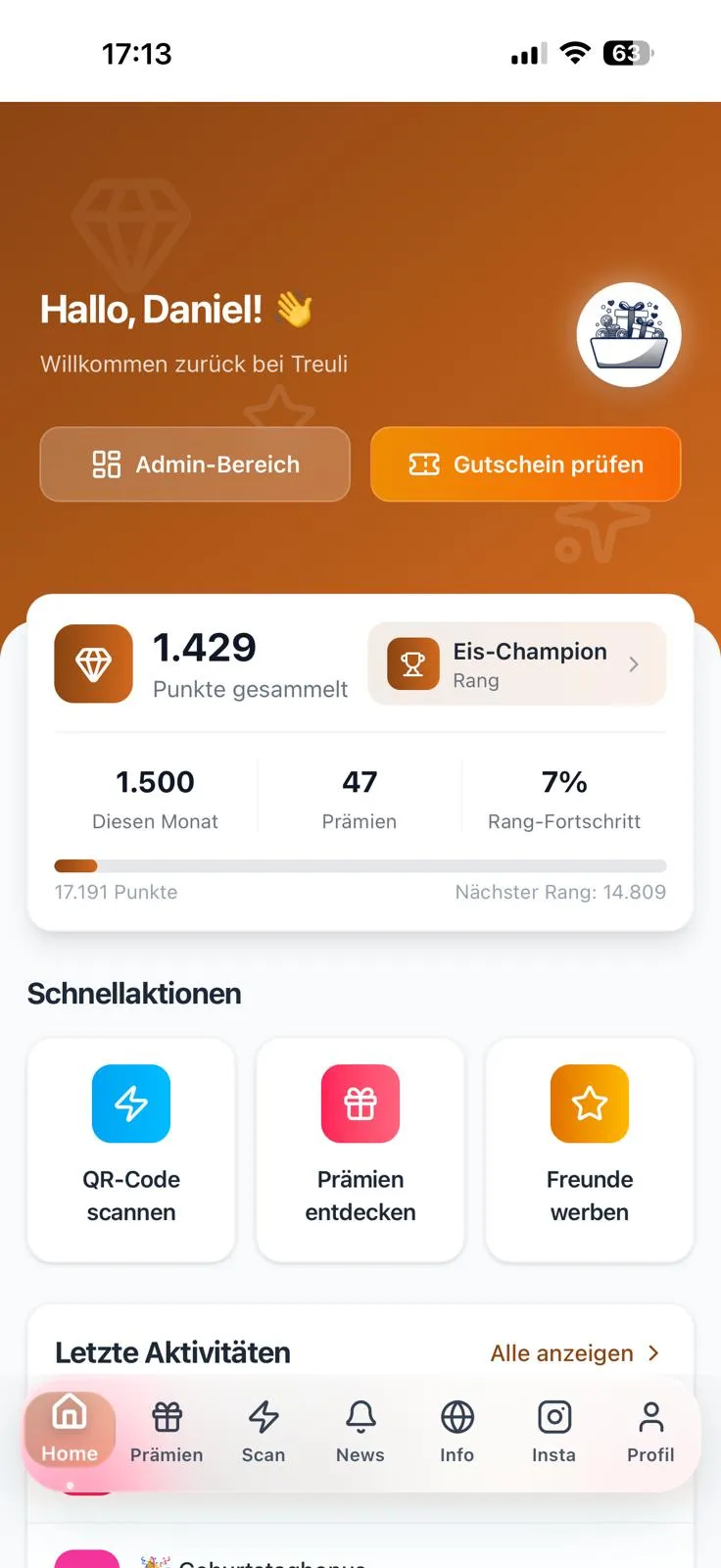 With every visit, customers automatically collect points and level up in rank.